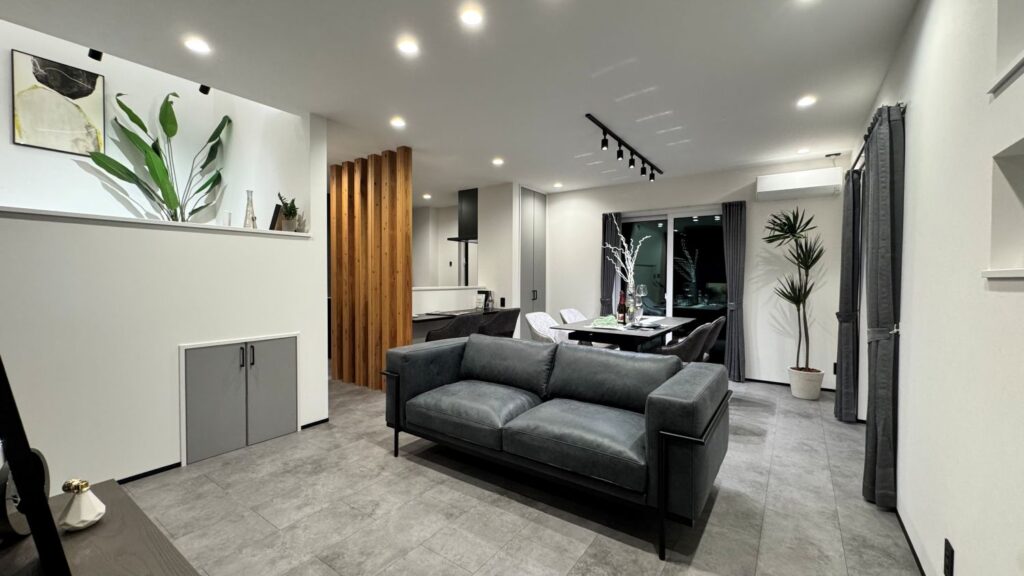 中二階吹き抜けと空間をやわらかく仕切る化粧柱が、開放感と落ち着きを両立。 広さを感じながらも、家族が自然と集まりやすいリビングです。